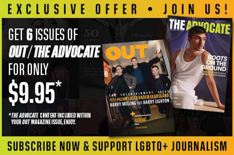 Get a year's subscription of The Advocate and Out Magazine for just $9.95.