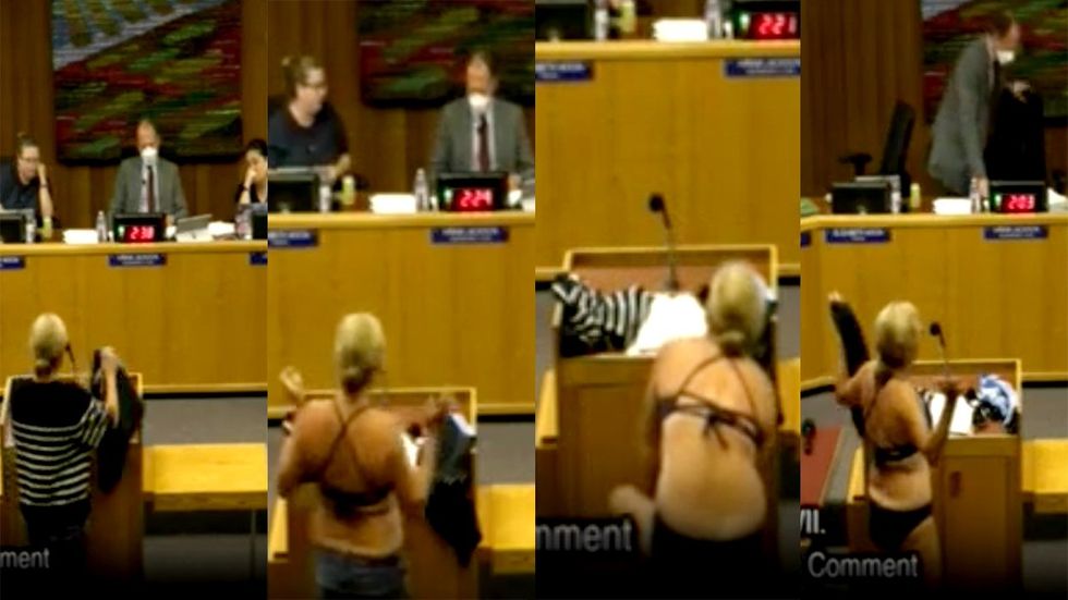 Beth Bourne, who has in the past come under fire for over-the-top anti-LGBTQ+ stunts, removed her pants and top at a Davis school board meeting.