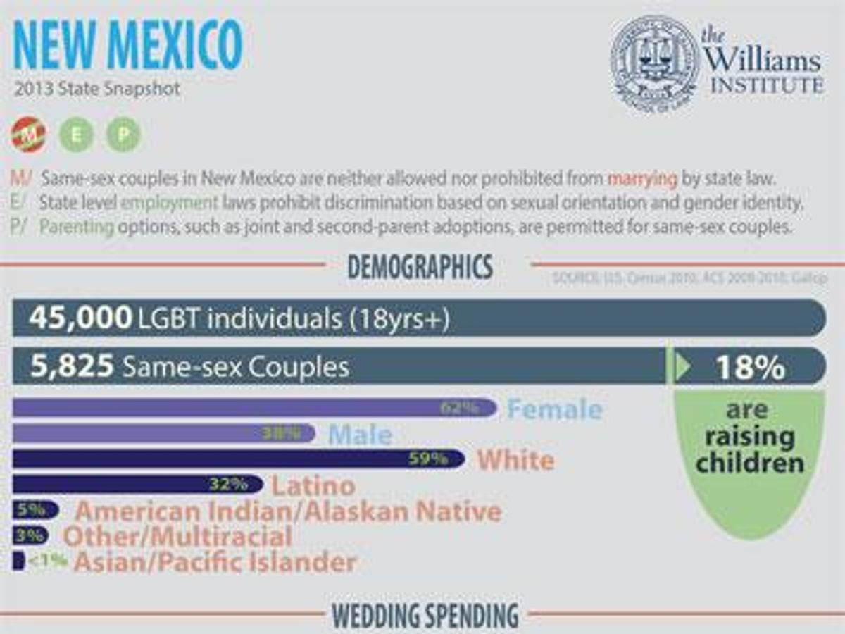 "If same-sex couples are allowed to marry in New Mexico, businesses will experience increased spending from wedding ceremonies," according to the Williams Institute, a think tank at the University of California, Los Angeles, law school focused on LGBT issues. "State and local government will gain from additional spending."