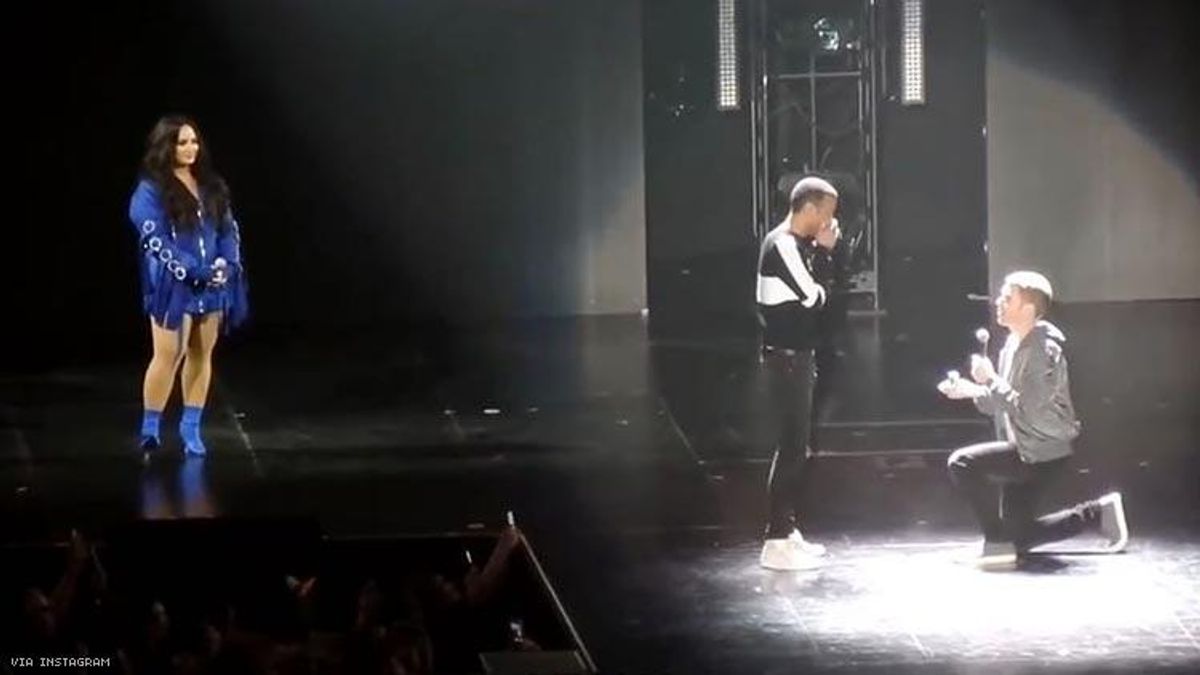 At one point during her Tell Me You Love Me concert Friday in Los Angeles, one of Lovato's dancers pulled Owen, an audience member, onstage. Then, Crone opened a trap door and got on one knee in front of the unsuspecting Owen.