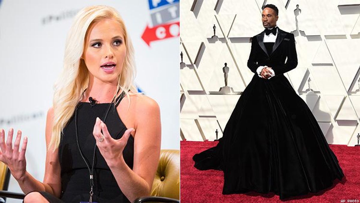 Fox News correspondent Tomi Lahren flipped oppressor and victim when she went after LGBTQ people for allegedly "attacking" traditional masculinity in a pair of tweets reacting to Pose's Billy Porter sporting a tuxedo gown on the Oscars red carpet Sunday.