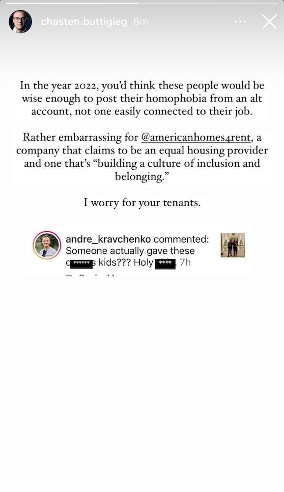 "In the year 2022, you'd think these people would be wise enough to post their homophobia from an alt account, not one easily connected to their job," he wrote as a caption. "Rather embarrassing for @AmericanHomes4Rent, a company that claims to be an equal housing provider and one that's 'building a culture of inclusion and belonging.'