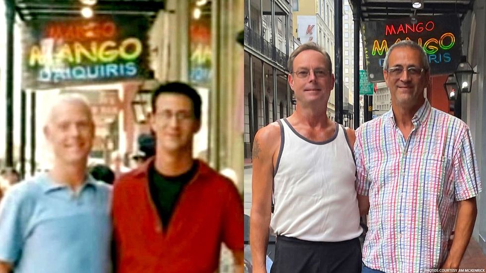 “So my husband Rick and I met in NOLA at Southern Decadence on Bourbon Street 23 years ago on Friday, September 1, 2000 (left),” read the post by Jim McKenrick. “Here is a picture of us (right) in the exact same spot where we met 23 years earlier, taken at Southern Decadence 2023. What an amazing 23 years it has been. We are still together and going strong. Love you, and here’s to another 23 years together.”