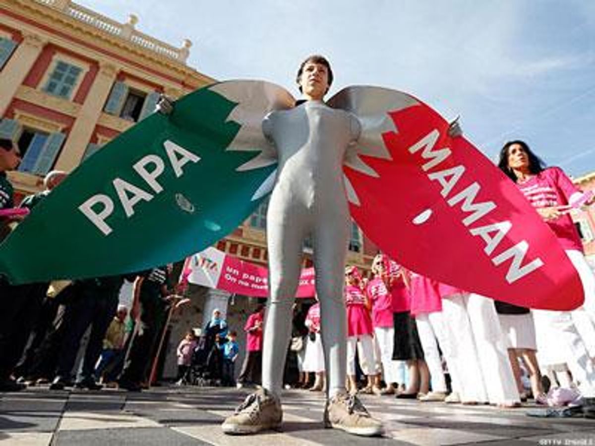 Two French lesbian policewomen, Raphaelle and her companion, Fabienne, pose with one of their three children on Wednesday near Lyon, in eastern France. They had twins, born in early 2010, and because of this Fabienne intends to obtain from the courts a right to paternity leave, which has been denied so far by the officials from the police department. An amendment to a proposed law that aims to fund the social security health care system and which is now being examined by Parliament proposes transforming paternity leave into a "childbirth leave," which would be bestowed regardless of a person's gender.