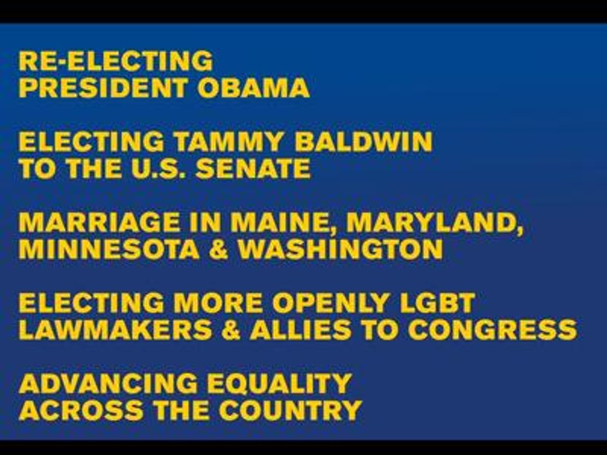 The video also highlights a record number of out LGB elected officials, including the nation's first out Senator, Wisconsin's Tammy Baldwin. Of course, the video also highlights president Barack Obama's endorsement of marriage equality, a statement that made him the first sitting U.S. President to support the freedom to marry.