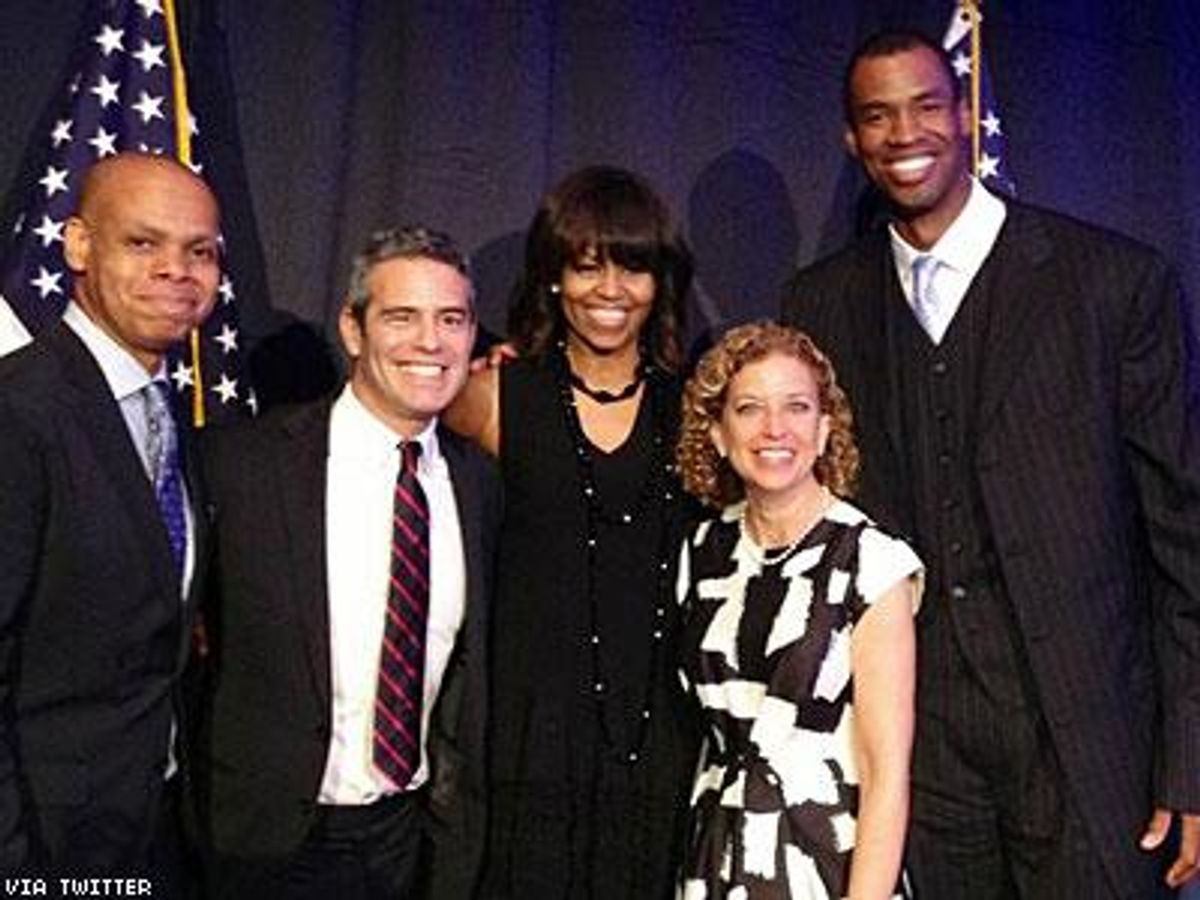 Jason Collins, the first active NBA player to come out as gay, and first lady Michelle Obama exchanged compliments at an LGBT-focused Democratic fund-raising event in New York Wednesday night.