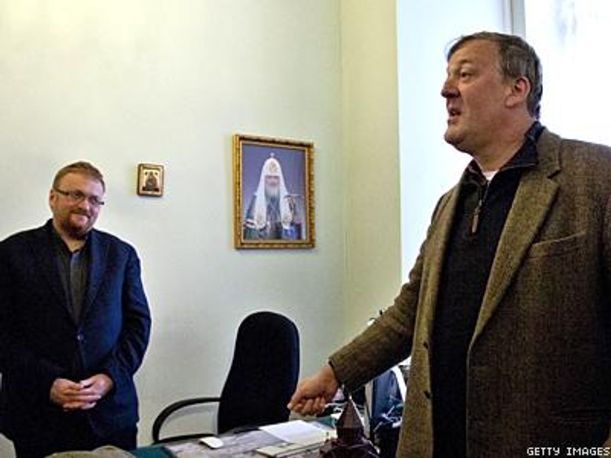 "For me Stephen Fry is a bringer of evil, as he expresses ideas which are evil," said Milonov, who recently made several outrageous statements to a French journalist, among them that gay people rape children, that reports of violence against LGBT people in Russia are fabricated, and that straight people are frequently victims of hate crimes committed by gays. Milonov crafted St. Petersburg's law against "propaganda of nontraditional sexual relations," on which the national law, passed this summer, was based.