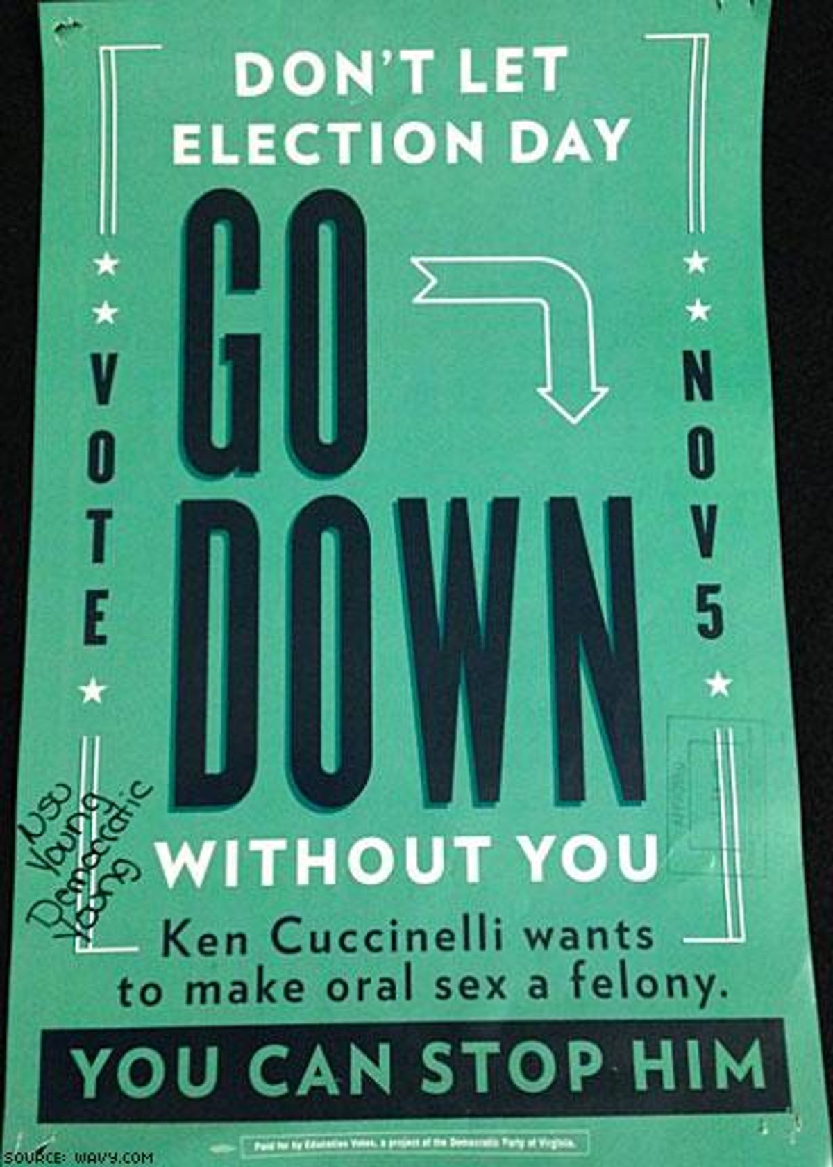 "Don't let Election Day go down without you," reads one of the posters, in all caps. "Ken Cuccinelli wants to make oral sex a felony. You can stop him."