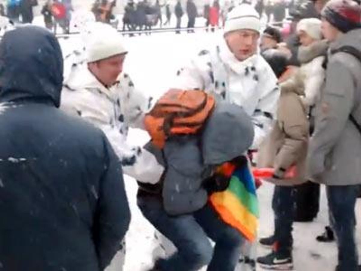 Video of the confrontation began circulating online today, where it's clearly visible that activist Pavel Lebedev is tackled and detained for briefly unfurling a rainbow flag during the Olympic torch's procession through the city of Voronezh, about 560 miles north of Sochi.
