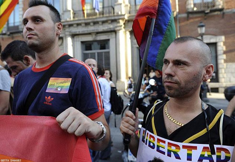Activists rally as part of an international protest against Russia's "gay propaganda" law and others targeting the rights of LGBT people. (At right: demonstrators outside the Ministry of Foreign Affairs and Cooperation in Madrid.)