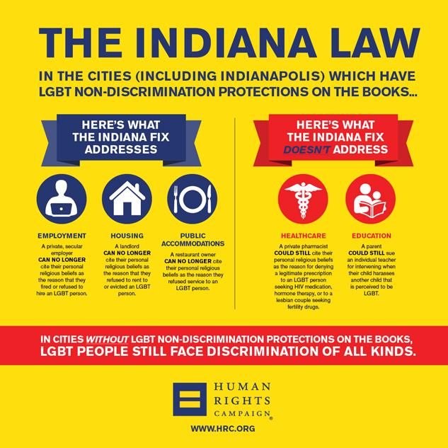 Noting that the amendment limits the damage of the state's RFRA, the Human Rights Campaign highlighted that LGBT Hoosiers are still without statewide nondiscrimination protections in housing, education, employment, and public accommodations. That in effect means it is still legal to deny LGBT people in Indiana housing, education, a job, or access to public accommodations -- except in those localities that have implemented more inclusive nondiscrimination ordinances.