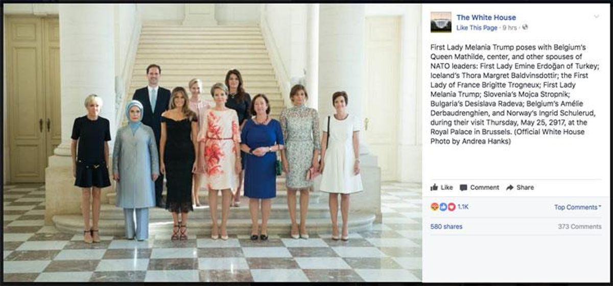 Destenay is the husband of Luxembourg's prime minister, Xavier Bettel, and he's clearly standing just over first lady Melania Trump's shoulder. Still, he wasn't initially identified in the caption. Meanwhile, every other person standing with the first lady is named in the caption -- all eight of them. Destenay's name was finally added to the caption about nine hours after it was posted.