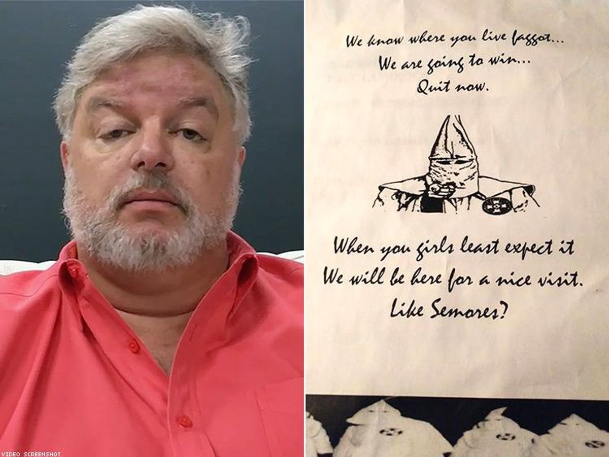 It features a drawing of a hooded Klan figure and a message beginning, "We know where you live, f****t." It urges him to quit the race and adds, "When you girls least expect it, we will be here for a nice visit." It bears a website address for the Ku Klose Knights, a division of the Klan reported to be active in Cape Coral, and contact information for a Klan chapter in Tennessee. Schneider posted an image of the letter on his campaign's Facebook page.