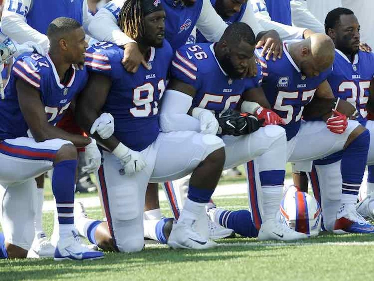 Many NFL players, some owners, and commissioner Roger Goodell have condemned Trump's comments, as have numerous NBA players. Players with several NFL teams knelt during the anthem today, like members of the Buffalo Bills, pictured above. And players for the Seattle Seahawks and Tennessee Titans stayed in the locker room during the performance of the national anthem before today's game in Seattle. The Seahawks players released this statement:
