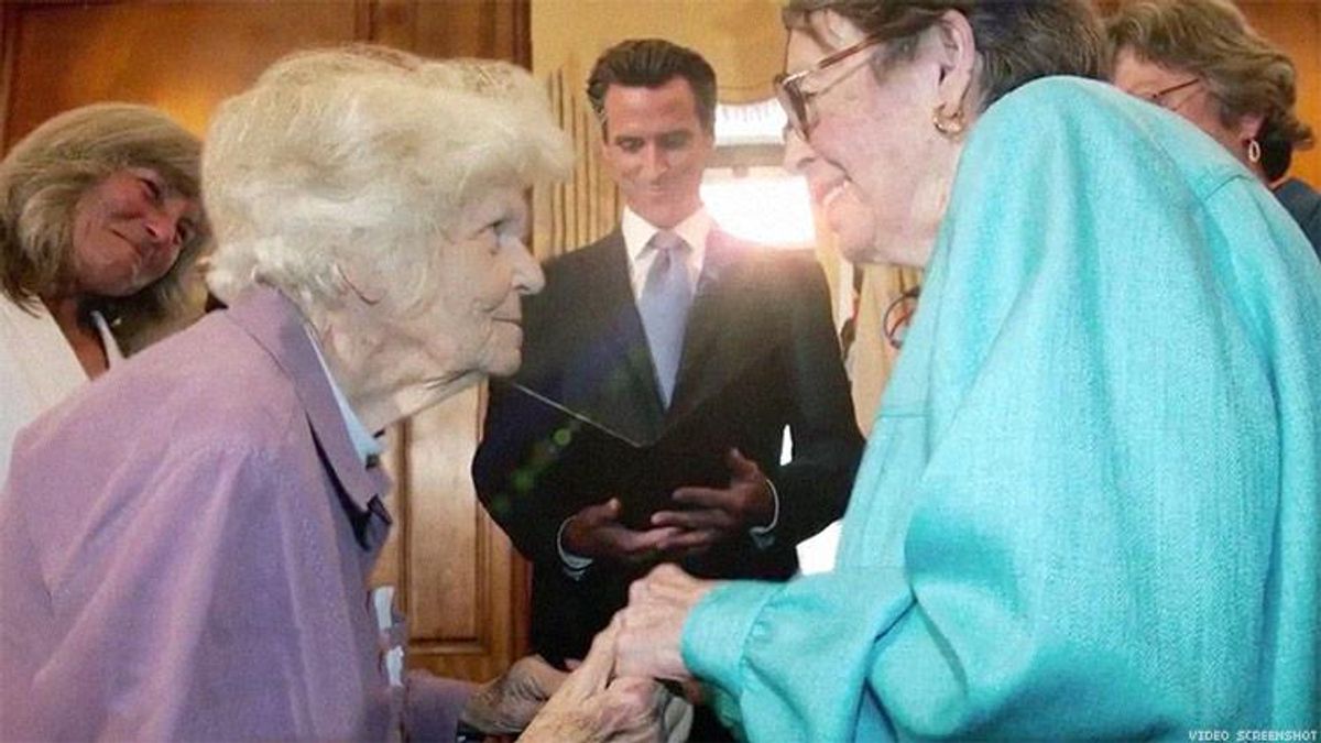 The ad, posted on Newsom's Facebook page Monday, shows him saying, "Today, we can confidently say, is the first day in the state of California that we are providing marriage equally and fairly to everyone." A voice-over calls Newsom "the first mayor to recognize the right to marry the person you love," and the ad features several same-sex couples, including LGBT rights pioneers Del Martin and Phyllis Lyon. They were married February 12, 2004, by San Francisco City Assessor Mabel Tang.