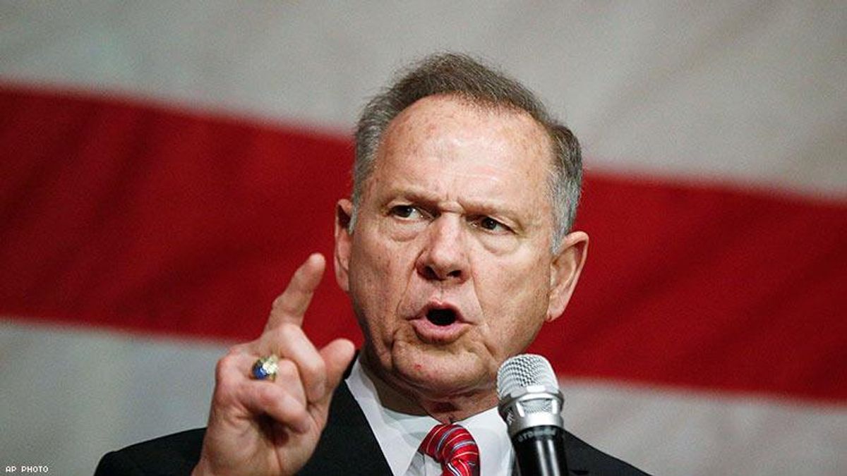 Moore has made a career demonizing LGBTQ people and pushing Christian supremacy. As the chief justice of Alabama's Supreme Court, Moore was removed from the bench in 2003 after refusing to remove a Ten Commandments monument from the judicial building. He was later reelected chief justice and suspended when he told Alabama officials to refuse marriage certificates to same-sex couples; he left office in 2017, a few months before running for Sessions's Senate seat.
