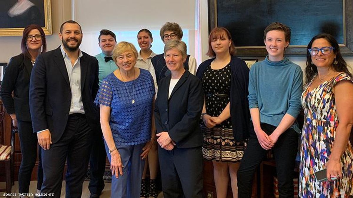 Above: Gov. Janet Mills (in bright blue, center left) and Mary Bonauto (center right) with young Mainers.