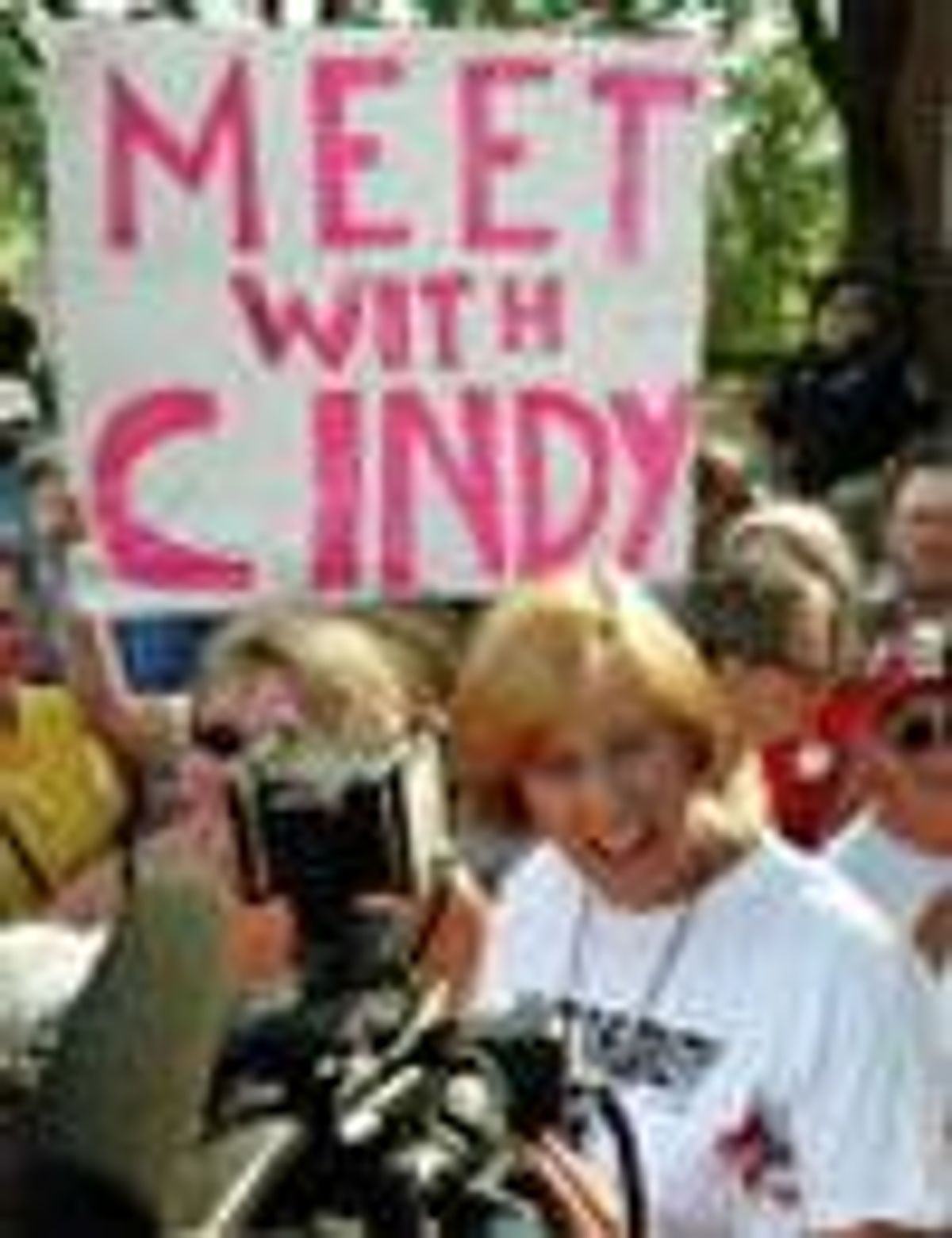 When we got to the field where a good-hearted Texas patriot had invited Cindy and her growing number of supporters to camp, we found a peaceful, hippie-like communal scene: a lot of easygoing people from all over Texas and all over America--and a lot of media people, most of them from other countries. And we found Cindy in the middle of it all. She had just returned from California. I walked over and introduced myself, told her how grateful I felt toward her for sharing her grief and her inspiration with the whole country, and gave her a big hug. I felt I was in a special presence with someone who represents the very best in all of us. Her strength and equanimity amazed me. Her mind is clear as she transforms the greatest tragedy a parent can undergo into a blessing for our country and for all humanity.