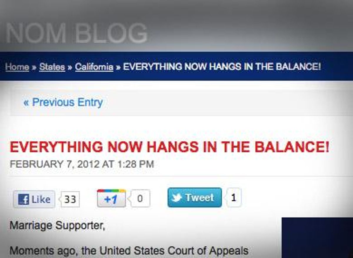 We, and those who love and support us, are ecstatic, but our opponents are hysterical -- and not the funny kind. On its home page, the so-called National Organization for Marriage blares in typical histrionic overstatement, "EVERYTHING HANGS IN THE BALANCE!" And then begs for money to take the case to the U.S. Supreme Court. The appeal letter, signed by its president Brian Brown, breathlessly concludes, "This is it. This is the whole ball game. If we lose here, the laws in 44 states defending marriage will crumble and we CANNOT let that happen!" Now, other than my show-tune queen boyfriends arguing over Patti LuPone versus Kristin Chenoweth, I have rarely seen such an overwrought, unrestrained plea. Oh, sorry, right. Brian Brown ...