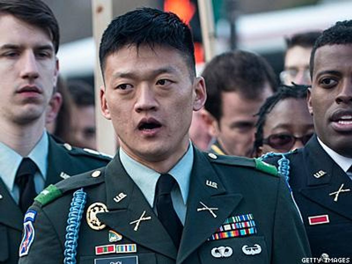 Former US Army Lt. Dan Choiwalks with other gay rights activists to the E. Barrett Prettyman Federal Courthouse March 28 in Washington, D.C. The former Iraq War vet and graduate of West Point is going to trial to face charges that stem from a November 2010 arrest for chaining himself to the White House fence to protest "Don't Ask, Don't Tell."