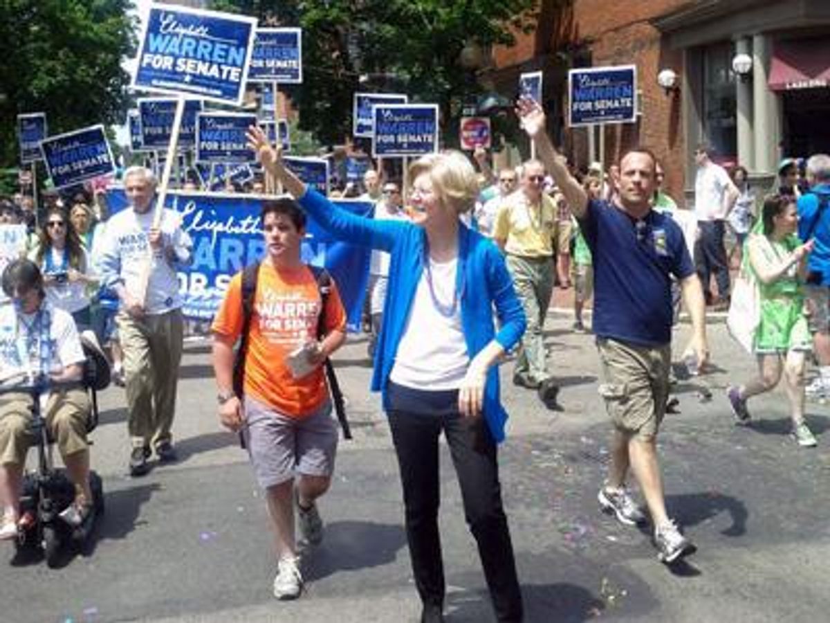Warren marched in Saturday's Pride parade through the streets of Boston, along with Gov. Deval Patrick and a contingent of supporters for President Obama's reelection.