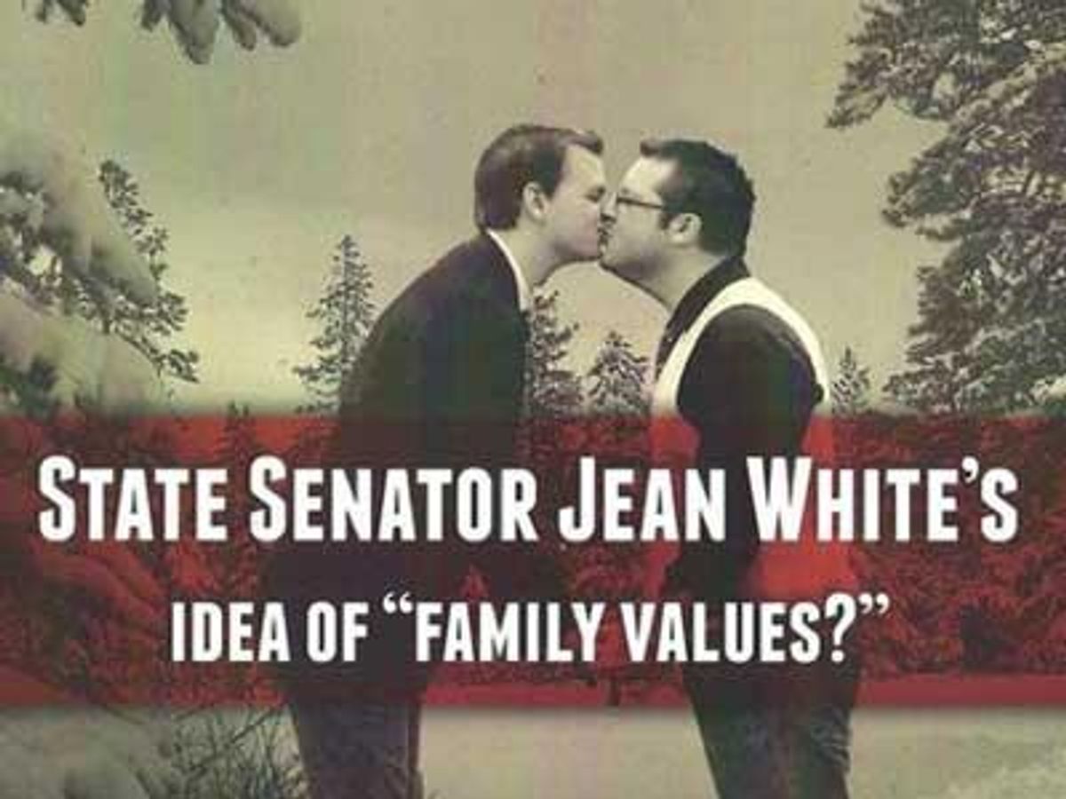 The Public Advocate of the United States, which is classified by the Southern Poverty Law Center as an antigay "hate group," had taken the photo right off the website, cut out the New York couple and pasted them in a Colorado setting, then slapped on it the question: "State Senator Jean White's Idea of 'Family Values?'"