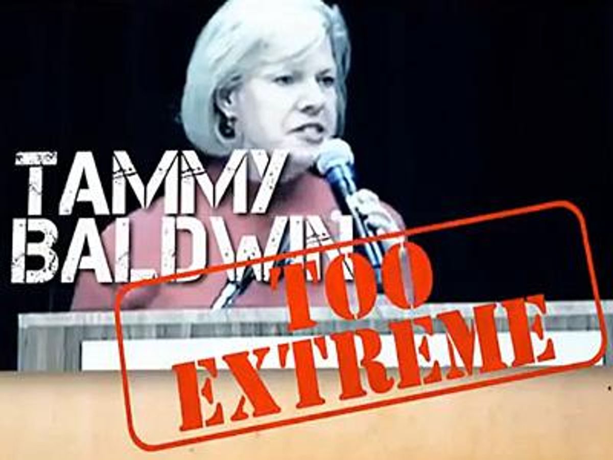 The 30-second spot, produced and funded by Crossroads GPS, says Baldwin is "just too extreme for Wisconsin" and features audio of the seven-term congresswoman saying "Damn right," a none-too-subtle attempt to portray Baldwin as a stereotypical angry lesbian.