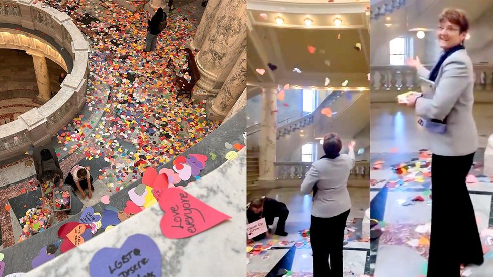 Thousands of paper hearts rained down inside the Idaho capitol as state lawmakers considered several bills targeting the LGBTQ+ community.