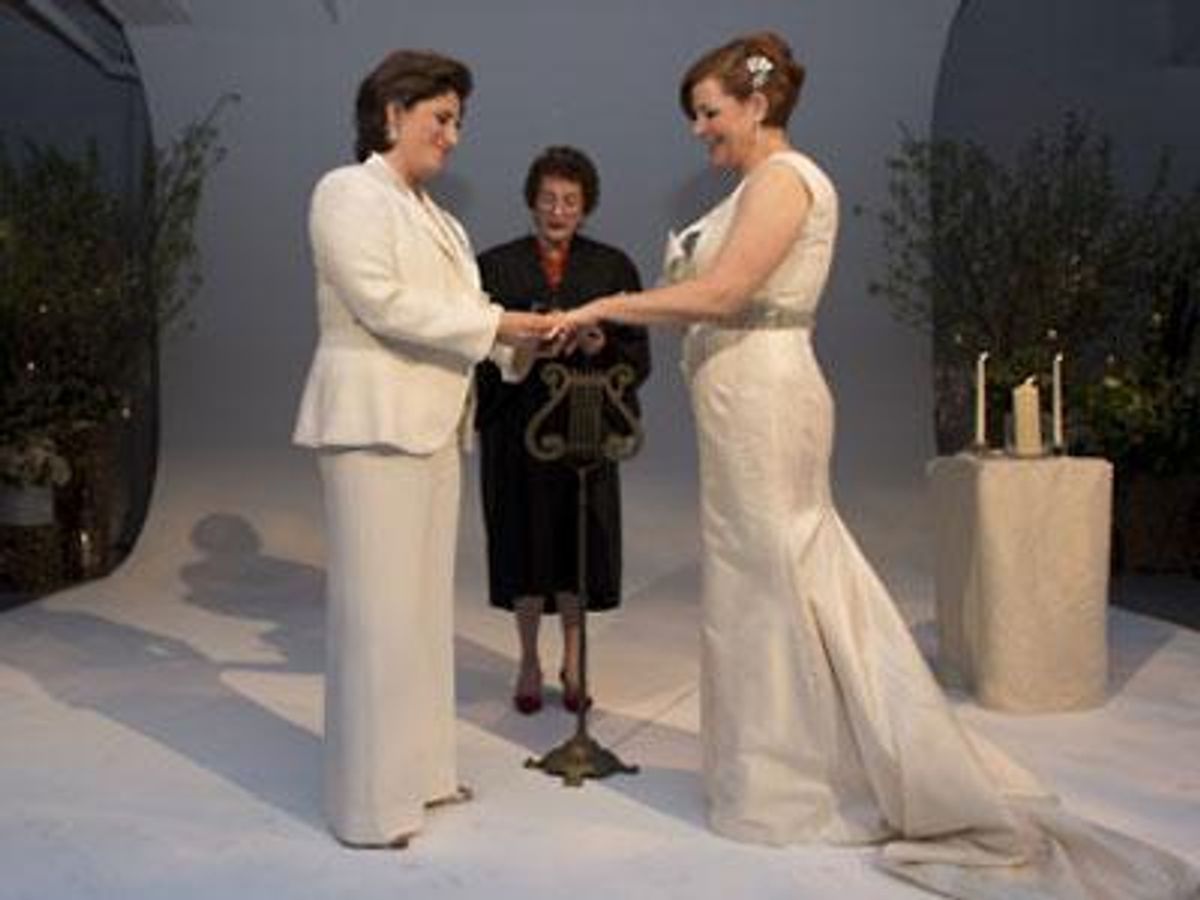 The evening ceremony was closed to the press, but journalists outside the venue offered Twitter updates about the comings and goings. Gay City News reports that shortly after 7 p.m., a spokesman emerged to announce that Quinn and Catullo, who are both 45, were officially married. Former Chief Judge Judith Kaye, who wrote the dissent in a 2006 court ruling that found same-sex couples had no right to marry in New York, officiated. Audra McDonald sang "She Loves" by George and Ira Gershwin before heading uptown to Broadway, where she is appearing in Porgy and Bess.