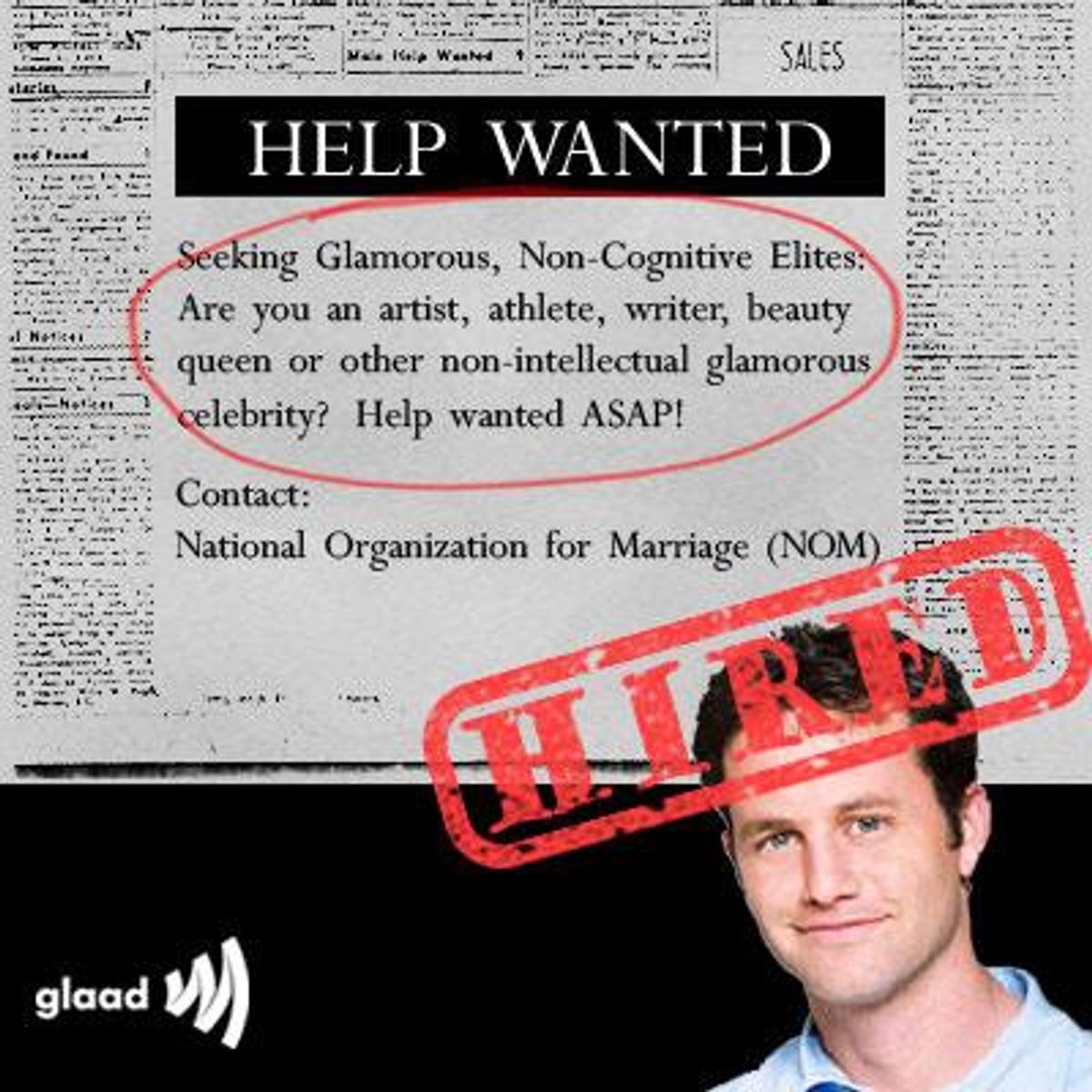 "Kirk Cameron and the anti-gay activists at NOM are making a claim that Americans know to be false," said GLAAD president Herndon Graddick. "This rhetoric won't work anymore. Communities across this country love and cherish their LGBT neighbors, friends and family members. This includes people in families headed by LGBT people. Their implication that LGBT couples can't create loving and stable homes is not only outdated and irrelevant; it's designed specifically to hurt those families."