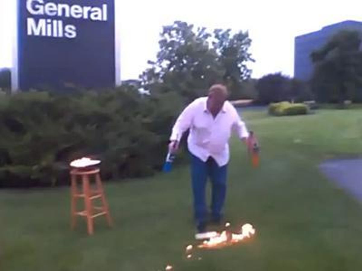 In the video, he is seen attempting to torch a Cheerios box while standing outside General Mills, which had sided against a proposed ban on marriage equality in Minnesota. Instead the grass around Leisner catches fire. The video has been seen more than 350,000 times since being uploaded on Aug. 5.