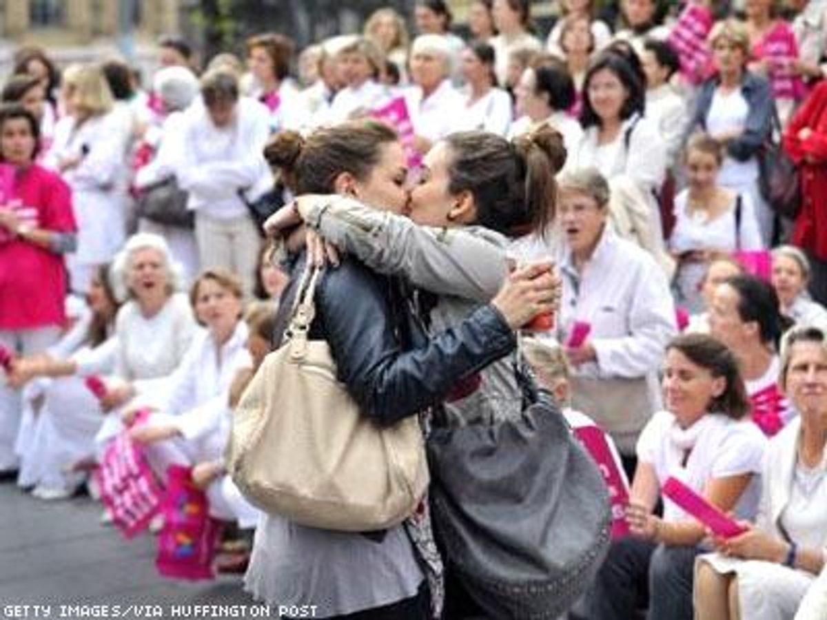 According to French gay magazine Tetu, both women are straight, but wanted to take a simple, meaningful stand in favor of equality. Julia, 17, and Auriane, 19, told the magazine the kiss was spontaneous, and clearly caught the protestors off-guard, evidenced by the open-mouthed expressions visible on several background faces.