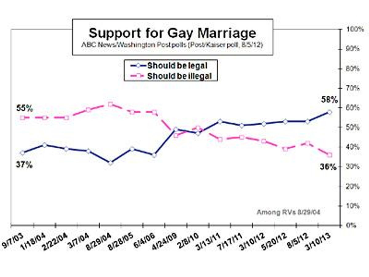 A striking 58% of respondents voiced support for marriage equality -- compare that to only 32% saying the same thing when asked nine years ago in a similar poll. Support for same-sex marriage rights rose among all groups, including conservatives and Republicans. Strikingly, 81% of those under the age of 30 believe in marriage equality.