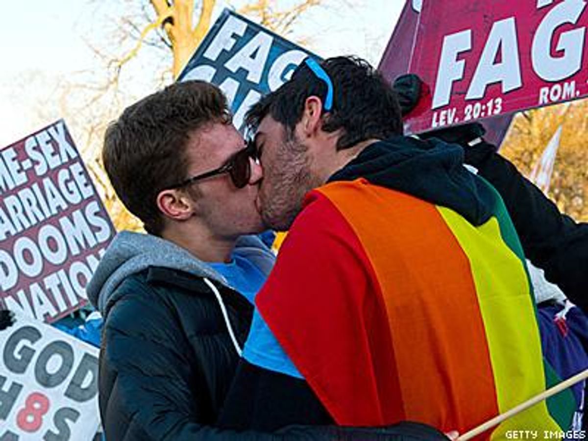 Michael Sabatino (left) and Robert Voorheis of Yonkers, New York, join hundreds of other people outside the Supreme Court before oral arguments in the case challenging the Defense of Marriage Act.