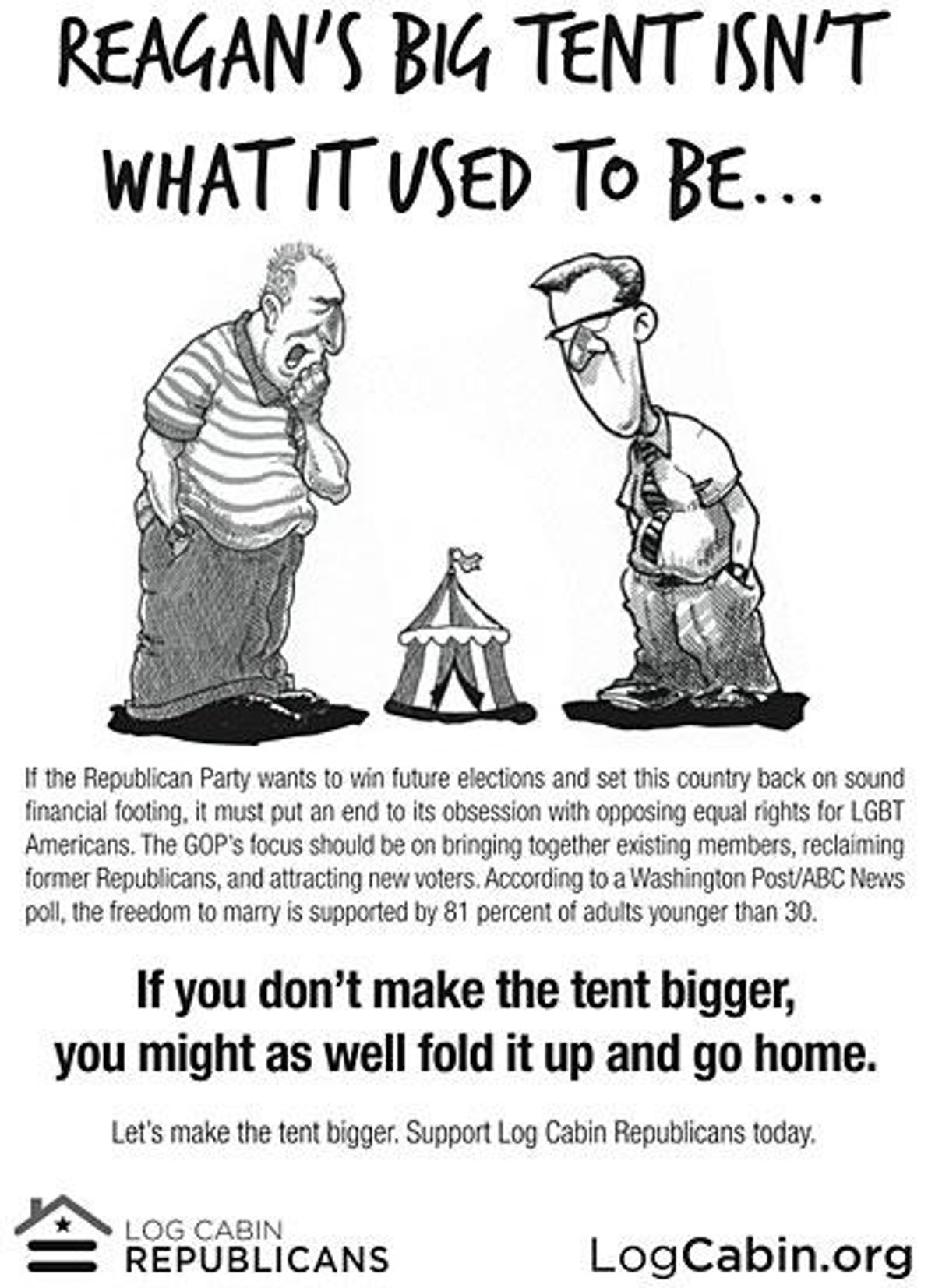 Evoking GOP patron saint Ronald Reagan's infamous "big tent" imagery, the ad reads, "Reagan's big tent isn't what it used to be. If the Republican Party wants to win future elections and set this country back on sound financial footing, it must put an end to its obsession with opposing equal rights for LGBT Americans."
