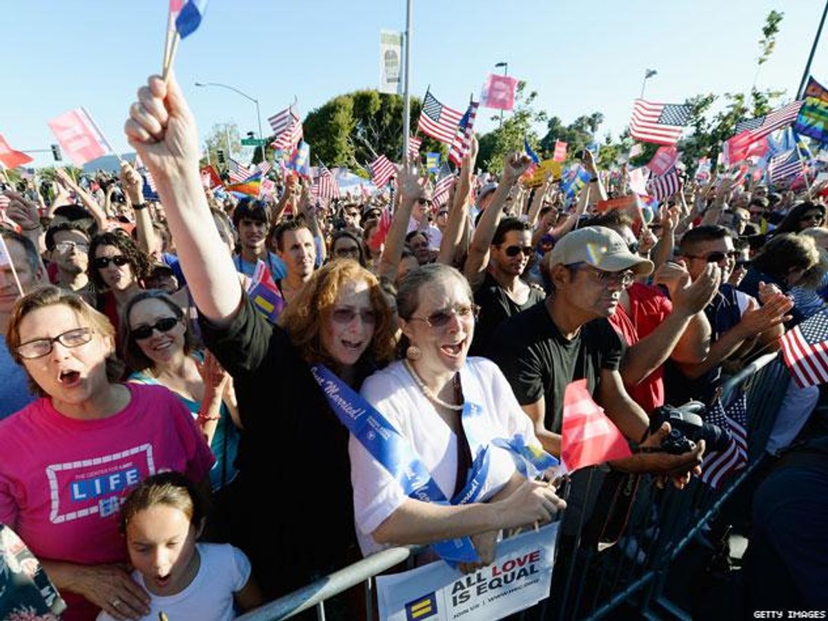 The jubilant group of thousands in West Hollywood had brought together friends, family members, and allies to celebrate the landmark Supreme Court rulings that struck down California's Proposition 8 and a key portion of the so-called Defense of Marriage Act. The rally carried with it a definitively celebratory and compassionate air.