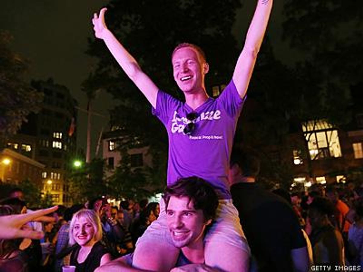 Edie Windsor (right), plaintiff in Windsor v. U.S. case, and Christine Quinn (left), speaker of the New York City Council, cheer as they are introduced to the crowd gathered outside the Stonewall Inn.