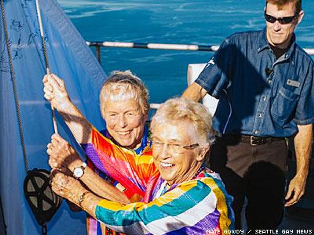 This year, a group of individuals instrumental in bringing the freedom to marry to Washington State raised a giant flag with a red Human Rights Campaign logo emblazoned across an outline of Washington State. Pride grand marshals Jane Abbot Lighty and her wife, Pete-e Petersen, were the first same-sex couple to legally marry in Washington last year, so it seemed fitting that the octogenarian couple, who've been together for more than 30 years, hoisted the flag to queer the state's most recognizable landmark.