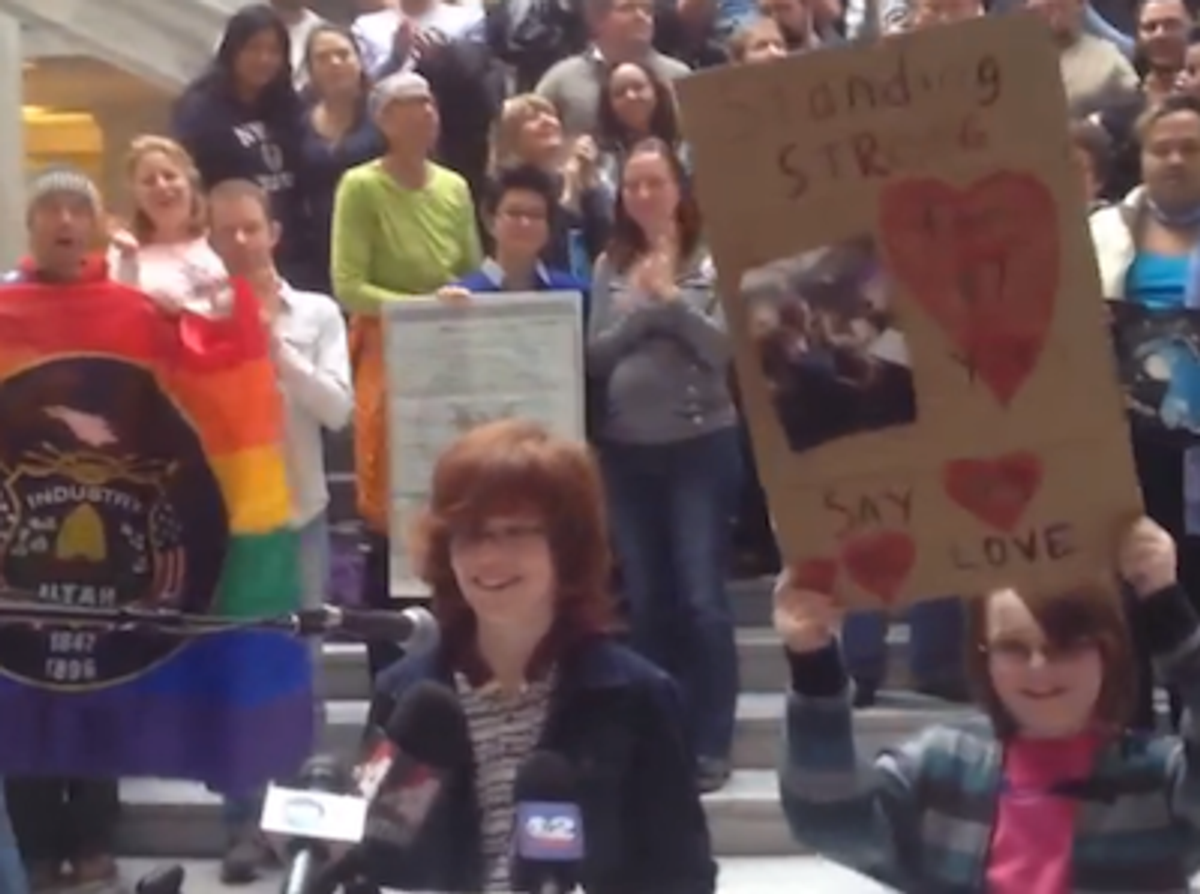 On Friday, an estimated 1,800 people rallied at Utah's capitol in Salt Lake City to support marriage equality. A petition calling on Governor Gary Herbert to recognize the 1,360 same-sex marriages that took place in the 17 days when such unions were legal was delivered to the Governor's office -- along with 58,000 pro-equality signatures, according to Towleroad.