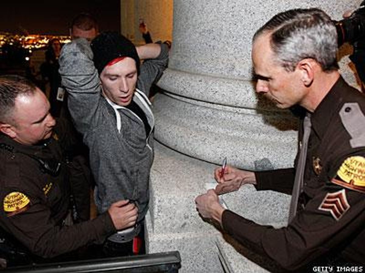 Tanner Crawford (center), a marriage equality supporter countering the antigay rally in the Utah capitol, is arrested by Utah Highway Patrol officers.