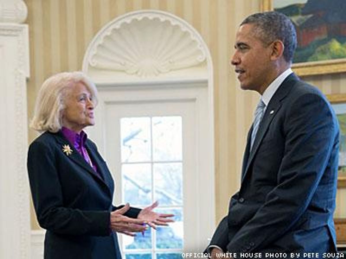 "When the Court handed down its decision last June, President Obama called Edie from Air Force One to congratulate her on her victory," wrote senior Obama adviser Valerie Jarrett on the White House blog today. "And earlier this week, the President invited Edie to the France State Dinner and the Oval Office to thank her in person. ... The thanks expressed by the President that day have been echoed by millions of Americans, including thousands of legally married couples who can now live their lives with greater justice and dignity -- thanks to heroes like Edie Windsor who have been willing to stand up and fight for equality under the law."