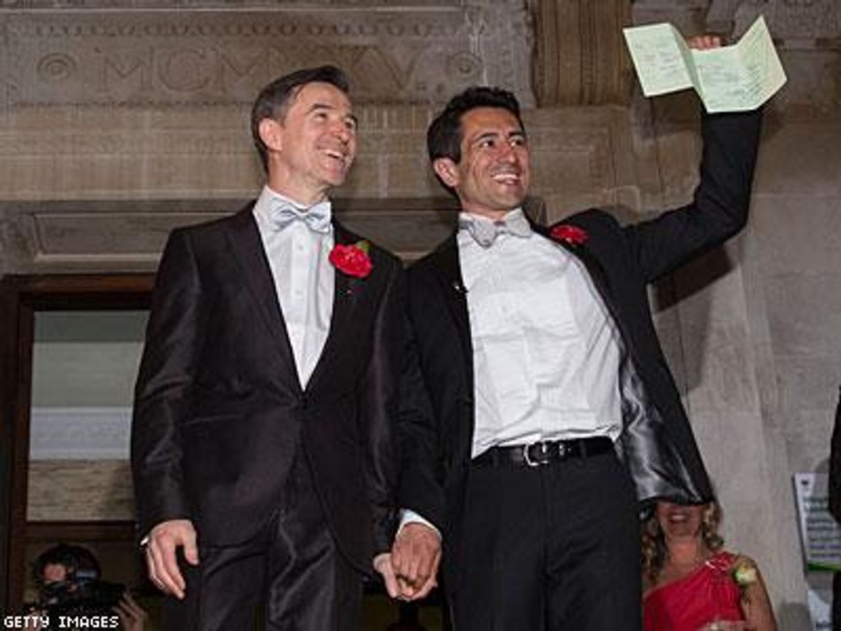 Peter McGraith (left) and David Cabreza kiss outside Islington Town Hall after getting married shortly after midnight in one of the UK's first same-sex weddings on March 29, 2014 in London, England. Same sex couples have been able to enter into "civil partnerships" since 2005, however following a change in the law in July 2013 gay couples are now eligible to marry in England and Wales. A number of gay couples had arranged for their wedding ceremonies to take place shortly after midnight on March 29, 2014, to become some of the first to take advantage of the new law. Parliament's decision to grant same sex couples an equal right to marriage has been met with opposition from religious groups. Same-sex marriage is currently being debated in Scotland, however the Northern Ireland administration has no plans to make it law.