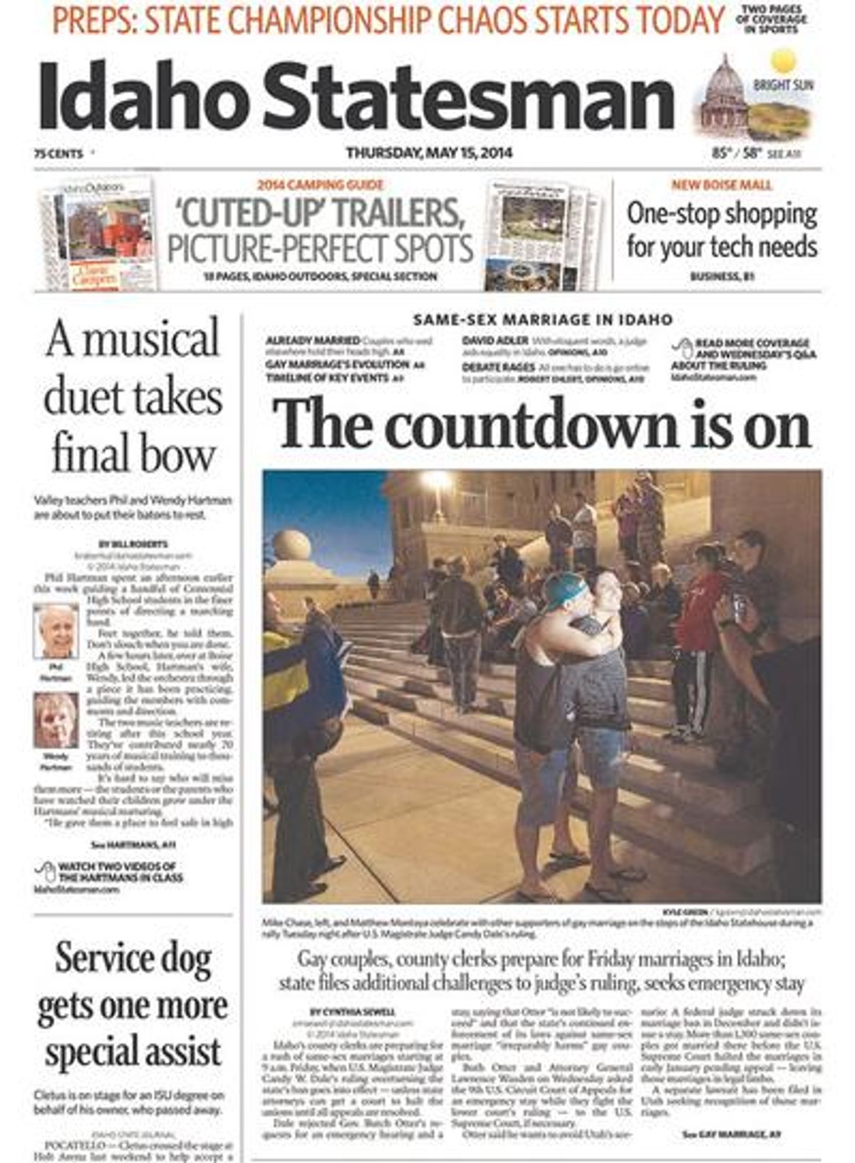 U.S. District Magistrate Judge Candy Wagahoff Dale Tuesday struck down Idaho's constitutional amendment banning same-sex marriage Tuesday, ordering the state to begin allowing such marriages at 9 a.m. Friday. The governor appealed that decision and filed a preemptive request for a stay, which Judge Dale denied Wednesday.