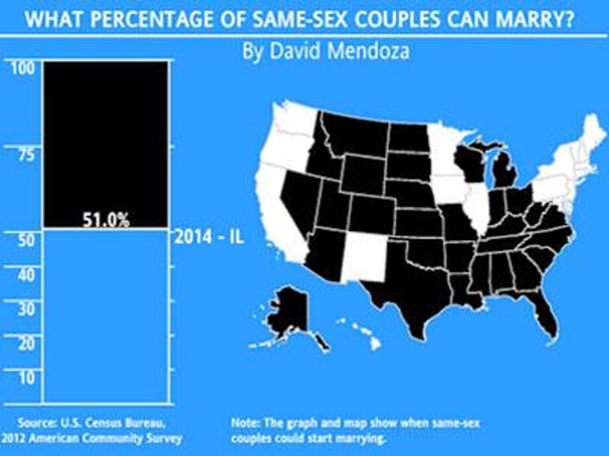 On The Mendoza Line, he reports that with Illinois (home to 3.9 percent of same-sex couples in the U.S.) becoming the latest state to offer equal marriage rights, it pushes the figure into the majority, with 51 percent of U.S. same-sex couples being able to marry in a state that recognizes their unions. California has the largest portion of same-sex couples in the U.S., with 14 percent of the national total.