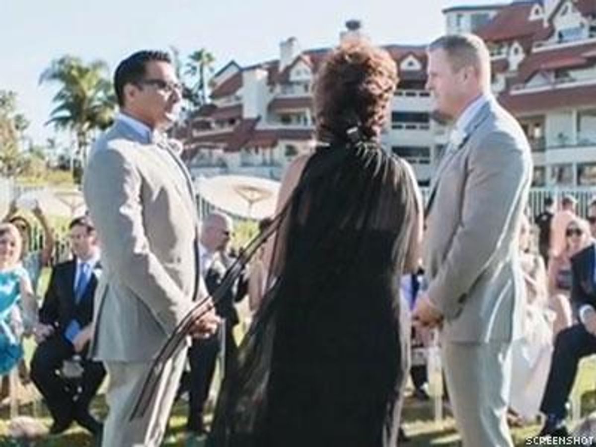 The wedding of a same-sex couple trying to tie the knot on Coronado Island near San Diego was marred by an onlooker shouting antigay epithets.