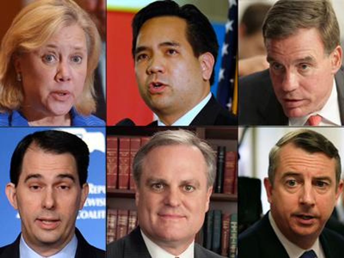 Top, from left: Mary Landrieu, Sean Reyes, and Mark Warner; bottom, from left: Scott Walker, Mark Pryor, and Ed Gillespie
