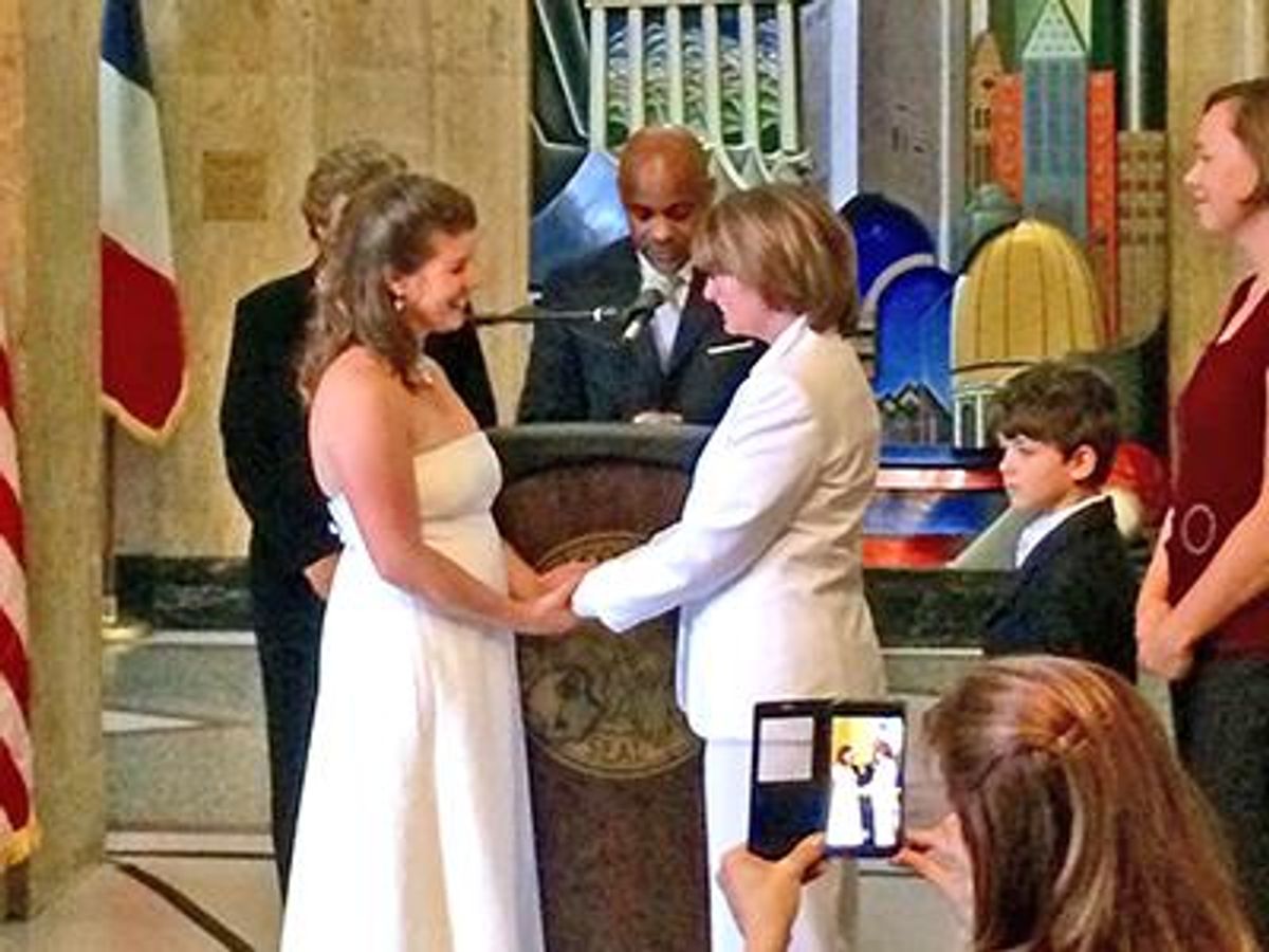 Anna (left) and Fran Simon are legally wed by Denver mayor Michael Hancock as the couple's son, Jeremy, and out City Council member Robin Kniech provide witness.