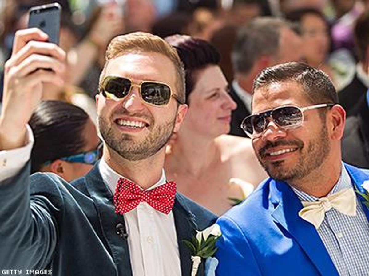 For years now, every time any newspaper, magazine, or blog has an article about gay and lesbian couples, the story is inevitably illustrated with stock art of a pair of same-sex cake-toppers. We've been trained through the media to believe that gay couples are sealed permanently together, our little plastic feet literally attached together in an inseparable solid flat blob like army guys. And if we ever actually tried to divorce each other, where are we going to go? It's lonely up there at the top of the cake, and neither one of us wants to climb down all those tiers and get frosting all over our tuxedos. We'll just stay together up here, thank you very much.