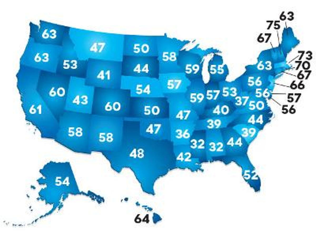 The PRRI numbers also include public sentiment from each state. The liberal Northeast and West Coast, unsurprisingly, had some of the highest support for marriage equality. A whopping 75 percent of New Hampshire respondents support same-sex marriage, and New England, New York, and the West Coast states had approval percentages at 61 percent or higher.