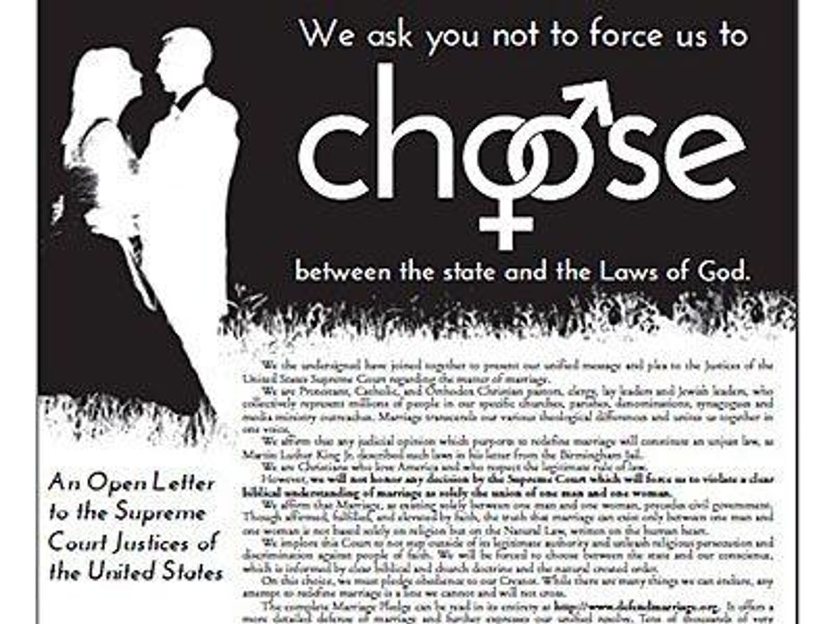 As The Advocate reported, the group also placed a full-page advertisement in The Washington Post and USA Today last week, declaring, "We will not honor any decision by the Supreme Court which will force us to violate a clear biblical understanding of marriage as solely the union of one man and one woman."